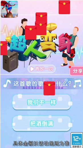 超人变身红包版是一款非常好玩的猜歌闯关领红包游戏,游戏有非常多的关卡,玩家可以在游戏中尽情的猜歌闯关,成功猜对了歌名就可以获得红包奖励哦,都是可以实时领取的,曲库非常的丰富,任何都有机会抢到红包,感兴趣的小伙伴快来试试吧。