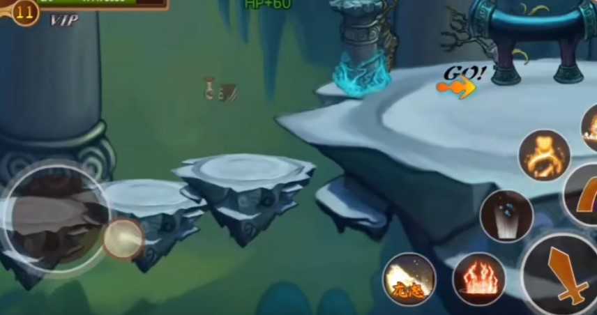 虚拟按键操作,屏幕左下角的箭头可以控制角色的移动方向,屏幕右下角是角色的动作控制区,包括跳跃、普攻和技能,可以一键触发。