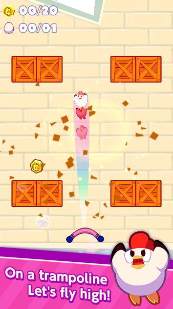 4、为了更好地让小鸡们的脱逃方案取得成功,利用弹簧床来绕开各类阻碍物,并毁坏炸鸡店的房顶,让它们逃到外边去吧!