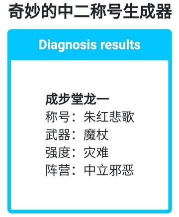 9奇妙的中二称号生成器官方版为玩家们带来了全新的称号生成模式和玩法,相信很多看过动画的玩家都知道,动漫的角色通常都有一个非常中二的外号,这些外号大声念出来会非常有羞耻感,而在这里你就可以生成属于你自己的中二外号了,只需要属于一些简单的内容就可以了。