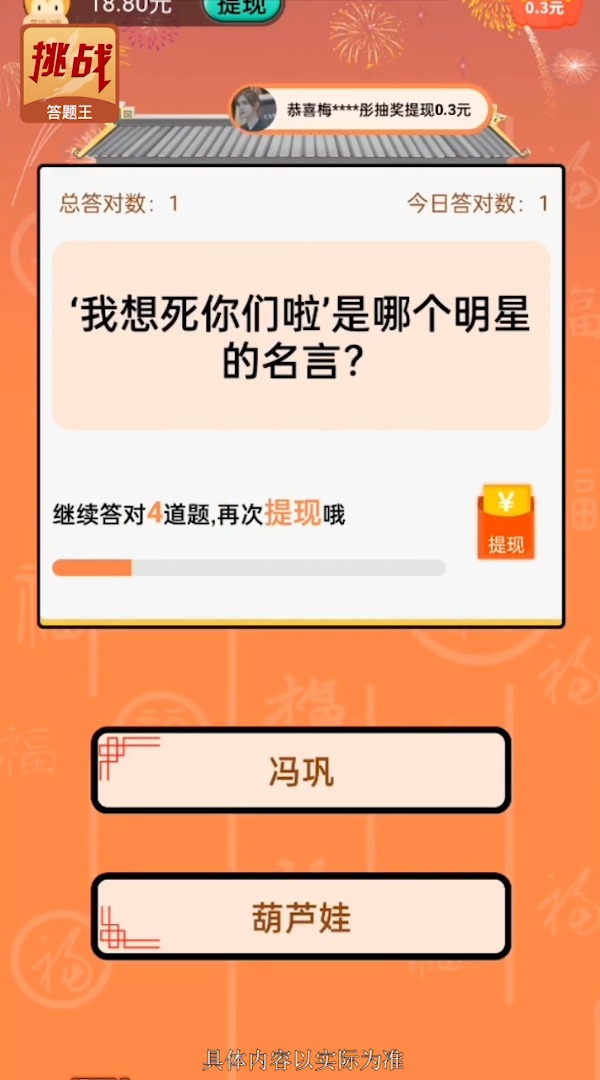 荣耀挑战红包版为玩家们带来了很多新的答题模式和玩法,让你可以掌握更多的乐趣,游戏拥有更多新的内容,每个玩家也都可以在这里掌握更多的答题玩法,你可以去挑战各种不同的类型的题目,只要答对就有机会获得红包,在这里是可以通过用你的只是来赚钱的,玩起来很方便。