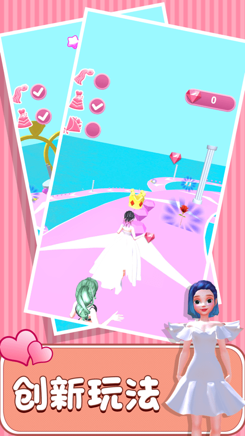 1、颠覆传统的跑酷模式,扮演小姐姐与其他的小伙伴进行比拼,路途中收集美丽的服装以及道具;
