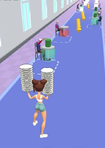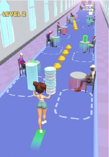 1、左右滑动屏幕控制人物挪动,抵达绿色区域时,将会搜集盘子,抵达红色区域时,就会为客户提供盘子。