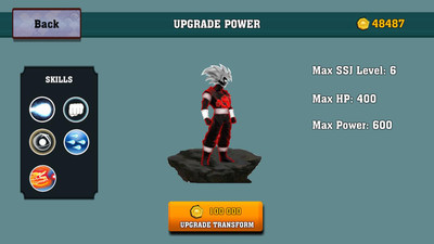 这个游戏中拥有悟空的绝技,例如龟派气功波,元气爆,持续龟派气功波,神龙召唤,元气弹。。。这些全都有超酷的动画和真实武打对战的刺激。除此之外,你也有机会来升级你所要的技能强度等级,让你变得更加强力和敏捷。这个升级系统将可以让你有机会打败多有得怪物和BOSS。