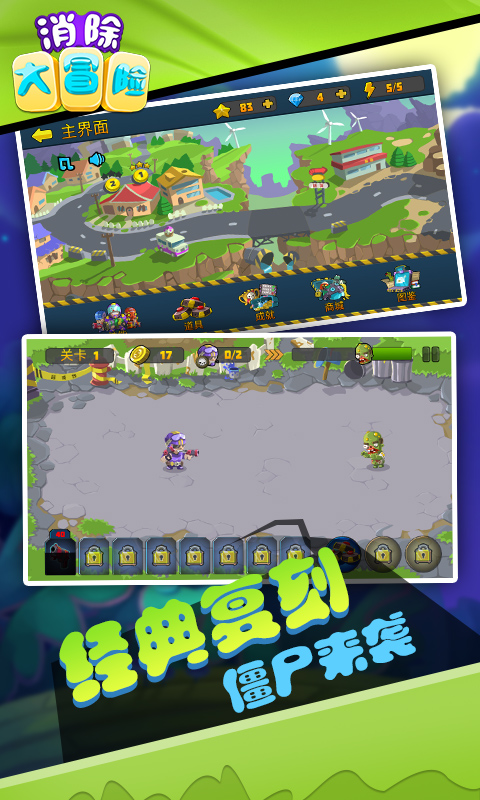 消除大冒险(僵尸射击)游戏安卓版是一款简单休闲的生存冒险游戏。有一天,在你生存的小镇上,三三两两的出现了一些僵尸,可是他们的感染速度太快了,你必须从小镇的入口迅速转移到小镇尾部,以此来躲避僵尸的感染,在移动期间大量的僵尸将会对你进行封锁围困,而你必须利用强大的机器人进行反击,赶紧来挑战一下,你能走到小镇的哪一个部位,甚至是完美通关?