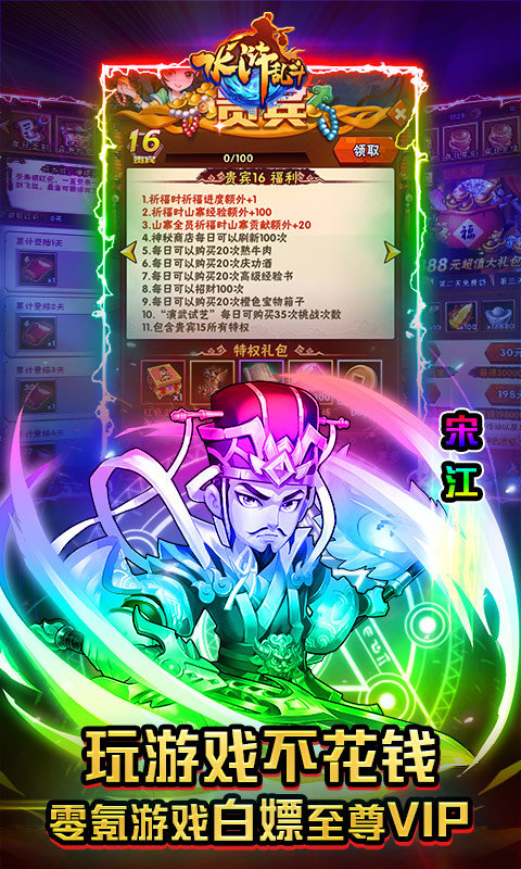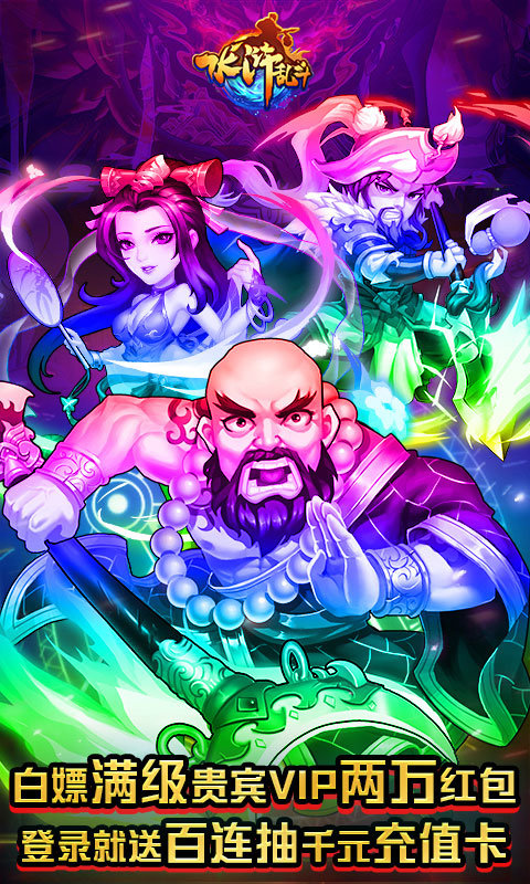 水浒乱斗上线送满V福利来袭!开局即送价值万元的满级VIP16,上线就送一百连抽,千元充值卡!挂机就能拿充值红包,一键夺宝还会掉落超多充值卡。开服活动就送四个神将,登录七天还送极品酷炫时装。仗义每从屠狗辈,好汉齐聚闯九州,风格独特的Q版画面,栩栩如生的武将制作,拳拳到肉的战斗打击感带来真实刺激的视听感受!本次满V版本福利超猛,限时转游、转区福利助您称霸区服,更有超多线下活动礼包可以申请,拳打镇关西,醉闯景阳冈,与108个好汉一起闯荡水浒世界吧!
