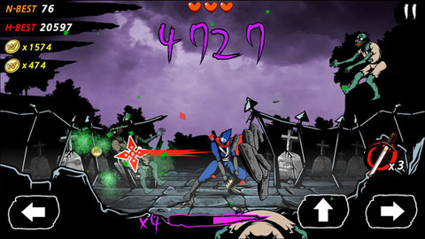 3.忍者之间的自由厮杀,游戏操作很简单,屏幕上就2个按键,一个跳跃一个进攻,你要利用这两个按键帮他通关