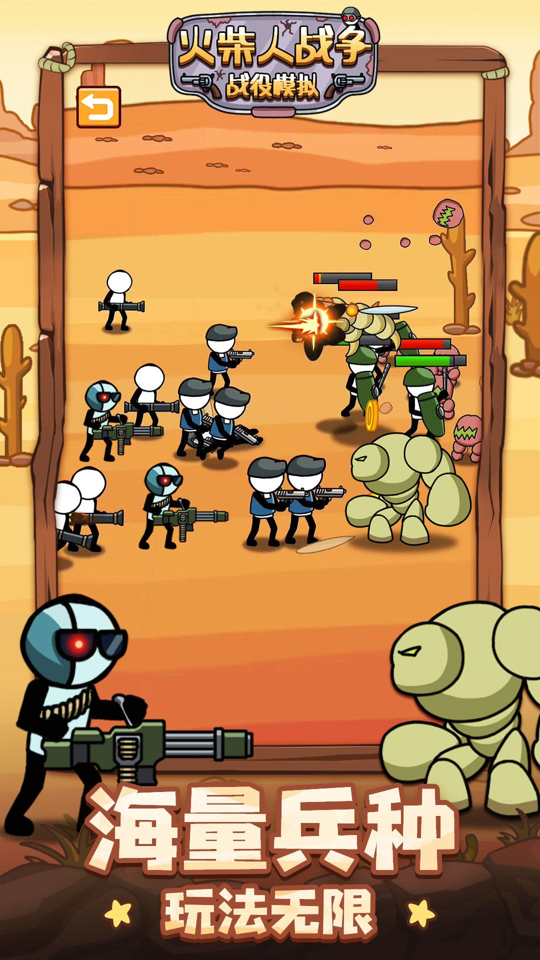 火柴人战争战役模拟游戏中你可以来通过自己的战争谋略来让自己的火柴人攻无不克玩家在游戏世界里,你可以利用上百种技能,玩家们还能够解锁更多强大的士兵,同时可以召集更多的火柴人士兵加入到你的队伍中哦。