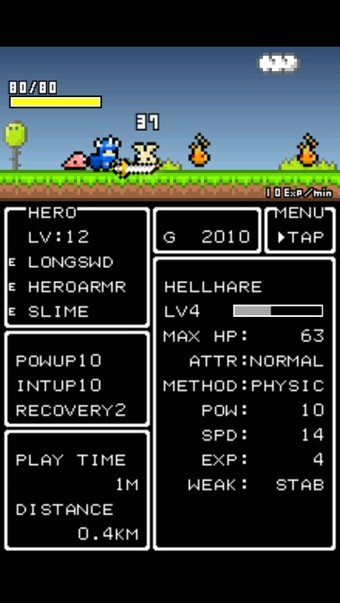 分分钟任务(minutequest)是一款像素RPG游戏,在游戏中我们控制人物一直前进,遇到敌人我们也不能退缩,除了前进就是死亡,快去看看你能走多远吧!