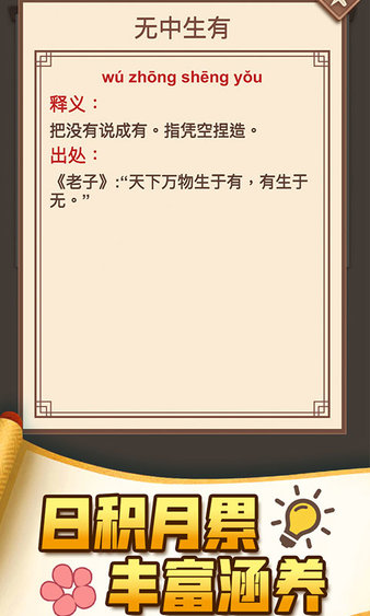 了解各种成语知识,让你能够学到每个成语拥有的典故背景,成为专业的猜谜达人;