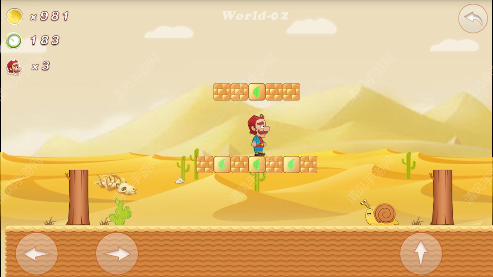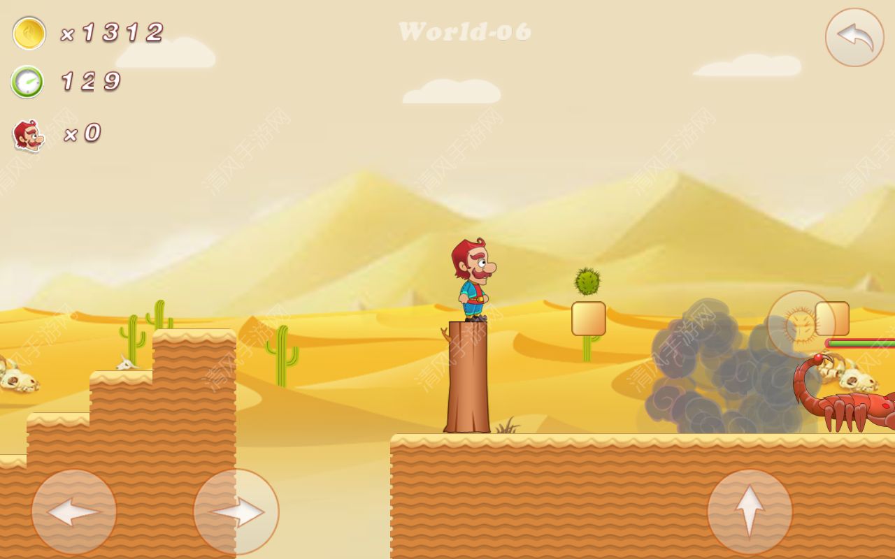 沙漠探险安卓版是一款简单好玩的益智类横版闯关手游,游戏中玩家扮演的是一个大家都熟悉的马里奥,在各种各样的地形上自由的跳跃闯关,游戏中场景是采用天灰色的沙漠背景,玩家所要攻击的对象就是沙漠的毒蝎,游戏操作简单容易上手,喜欢的玩家可以试试,带你走进童年的感觉。