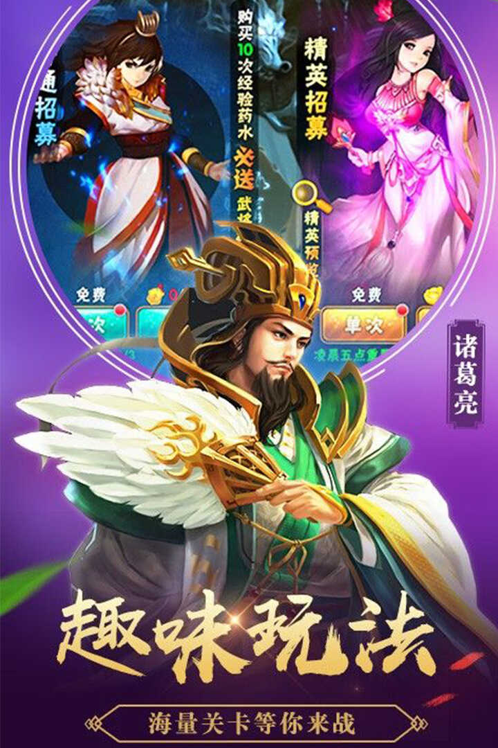 本作不同于传统三国类游戏,玩家开场时便已成为坐拥天下的主公,魏蜀吴群四大阵营武将任意招揽,梦幻阵容免费组建!