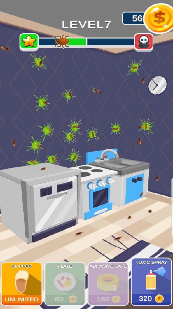 2.游戏有着卡通风格的画质,还有多种消灭蟑螂的道具,使得游戏更加有趣。