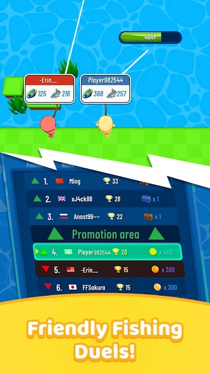 鱼王友好的钓鱼决斗:这是一个不会让你感到无聊的钓鱼游戏,玩家在这款游戏中进行这种有趣的钓鱼体验,相比你的钓鱼技巧,游戏还会自动随机匹配更公平的玩家。有了一定的时间限制和多轮比赛,每场比赛都会淘汰实力较弱的选手,最后剩下的是最后一个鱼王。这款游戏非常有趣!