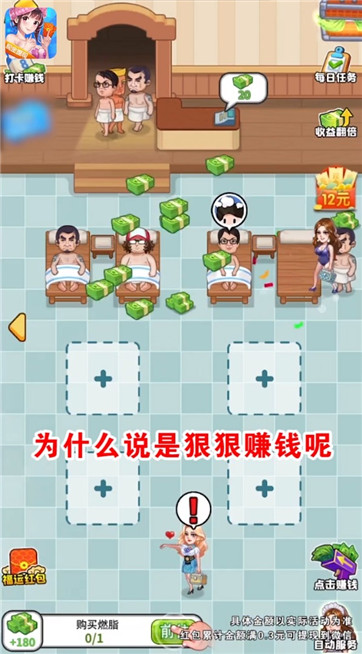 这是一款可以获得真实奖励的游戏,别的游戏都是氪金,这款游戏却可以赚钱,还在等什么呢,快点让你的洗浴中心开张吧。
