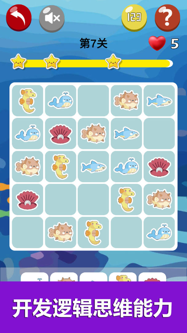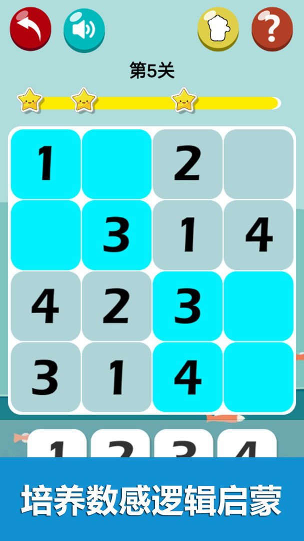 1、数独游戏有三个不同的主题森林、浅滩和深海。它有超过200个级别。
