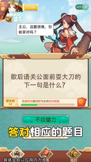 三国大文豪手游是一款操作非常简单只要答题闯关就能解锁红包的游戏答得越多领取越多奖励,不同的策略玩法比拼,给你不同的体验感,三国大文豪游戏玩法模式多变玩家需要熟悉之后才能上手,三国大文豪带给玩家们一个不一样的塔防游戏。