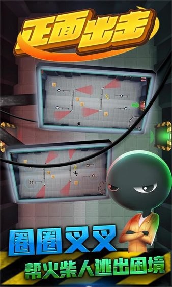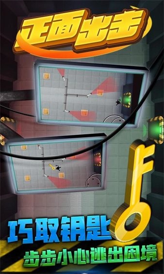 正面出击是休闲闯关类型的小游戏,玩家通过操控游戏主角来躲避灯光的照射,去获取钥匙打开通往下一关的大门,通过则顺利闯关成功。如果被灯光照射到,游戏则失败。