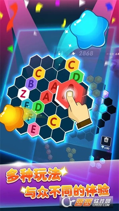 8六边形消消消六角拼拼乐游戏这款游戏作为六边形的消除游戏游戏中利用了传统的消除模式,但是消除的方块从方块变成了六边形,使得消除变得更加的容易了,拼出最合理的状态然后一次性大量的消除,赚取高分。