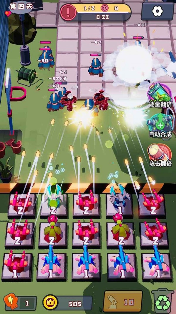 使用炮塔抵抗敌人的攻击,升级低级炮塔的合成以增加它们的火力。