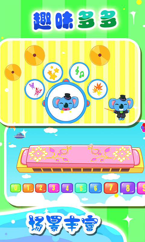 帮助小朋友学习音乐的启蒙教育软件。准确地来说,它更加像是一个音乐游戏软件,内含了各种各样的小乐器,每一种乐器都严格按照真实的乐器进行了模拟还原,音色模拟非常的逼真,可以供宝宝去选择玩耍