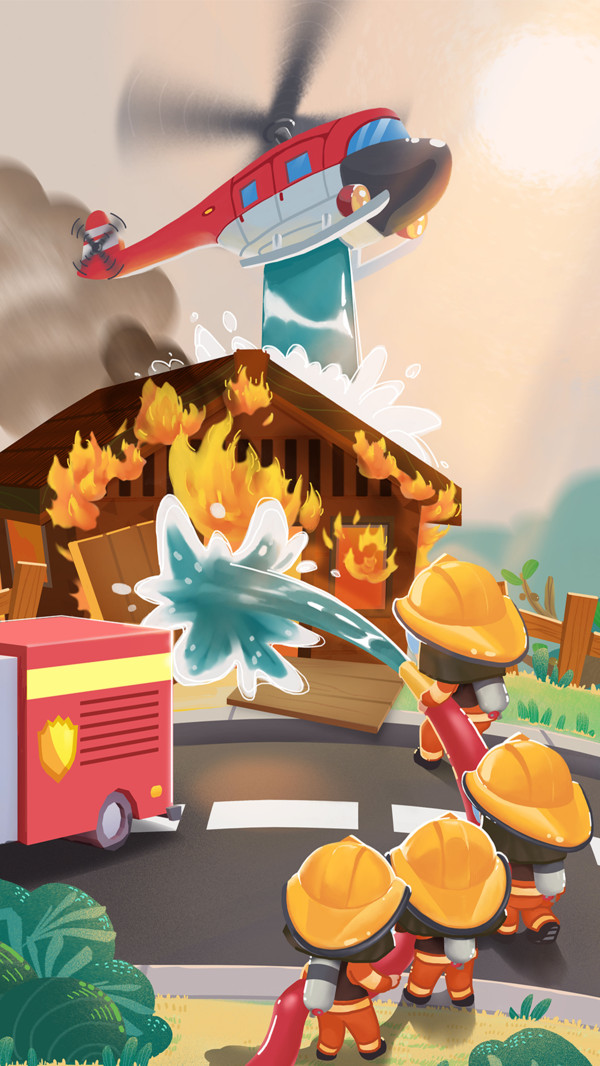 可以使用道具灭火,防止火势蔓延。每个场景也很卡通。