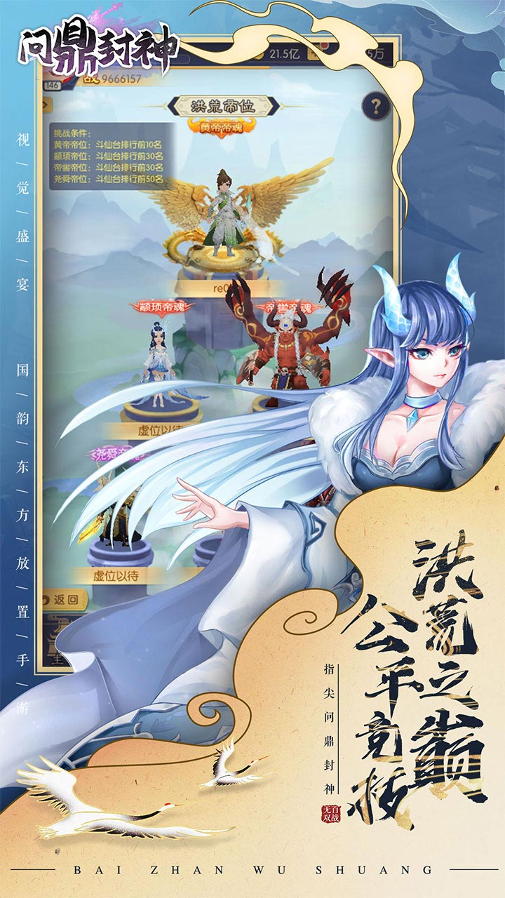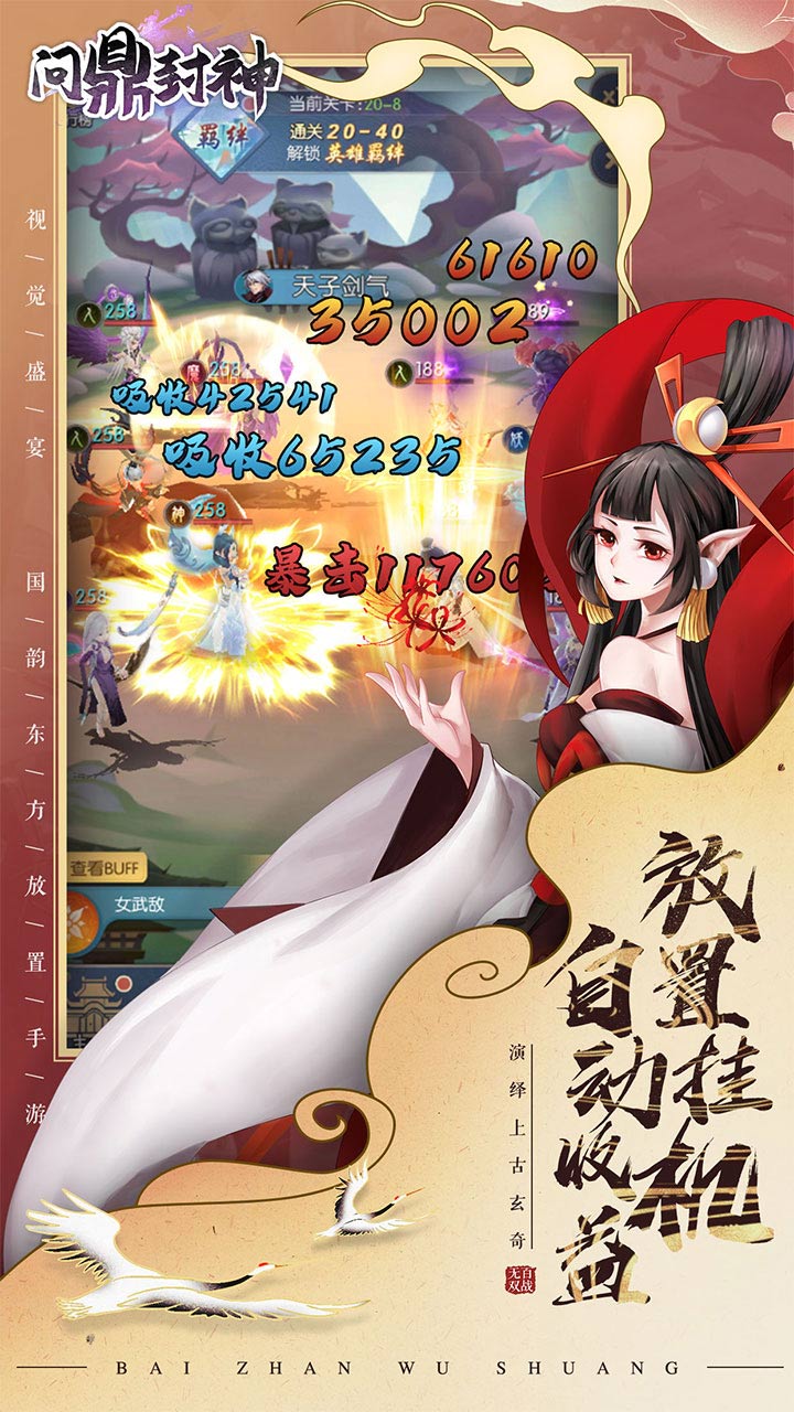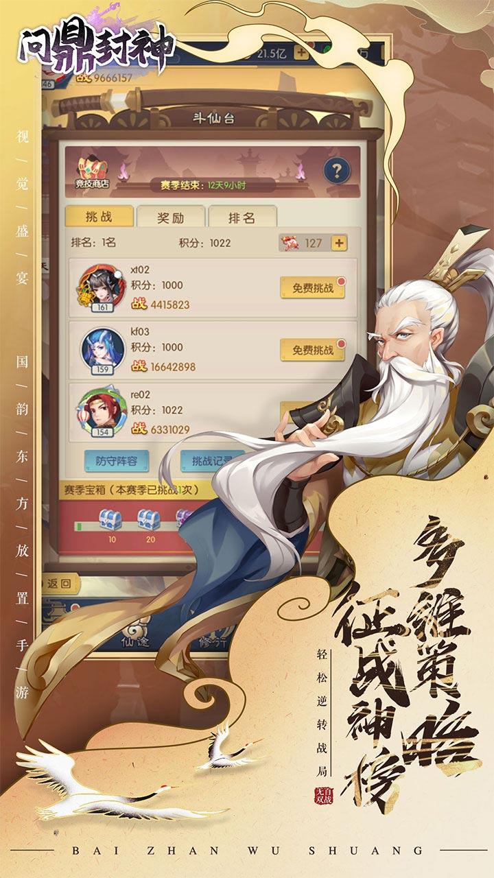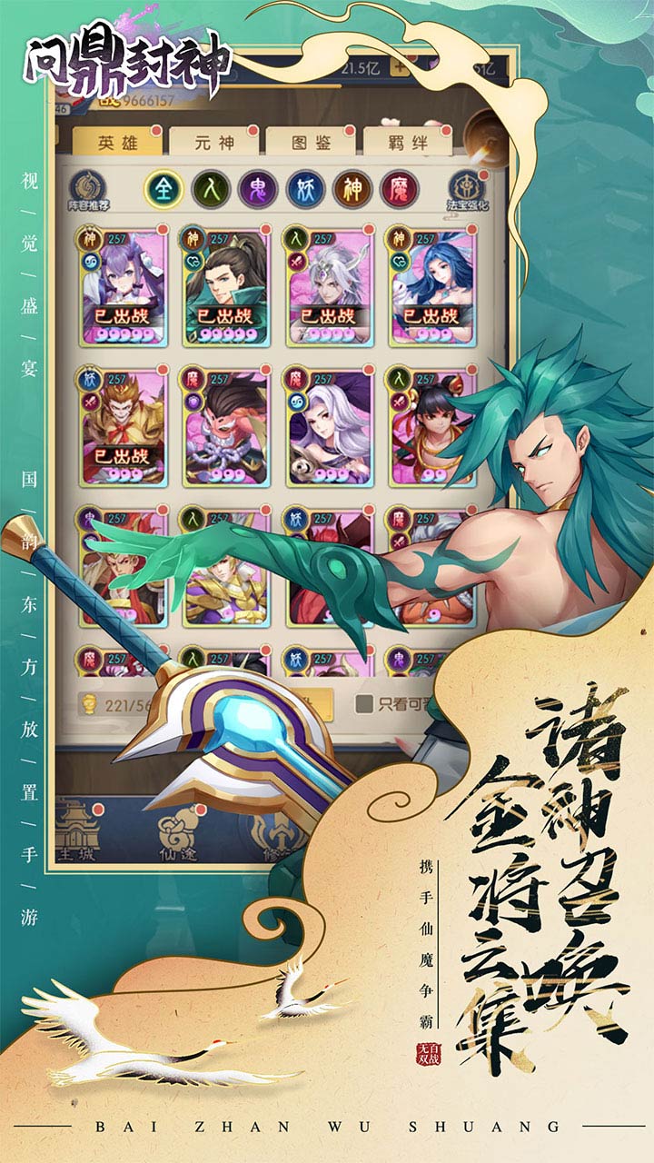 问鼎封神是一款放置卡牌策略类游戏,游戏上线就送一百连抽,爆率超高,顶级卡牌随便出,游戏还拥有放置玩法,不需要玩家肝氪,就能够随意游玩,是一款十分不错的放置类游戏,快来体验吧。