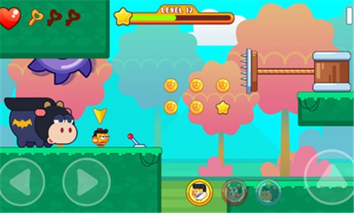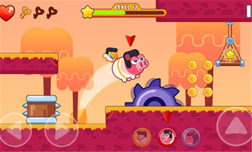 这是一款跑酷闯关游戏,以横版卡通的界面进行打造,玩法很是有趣,玩家在关卡中所获得的积分越高,通关评分就越高,奖励也和此有关。关卡中也有很多的道具,玩家可以自由捡取使用。