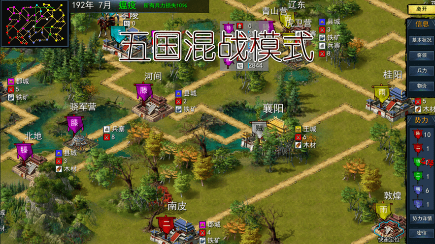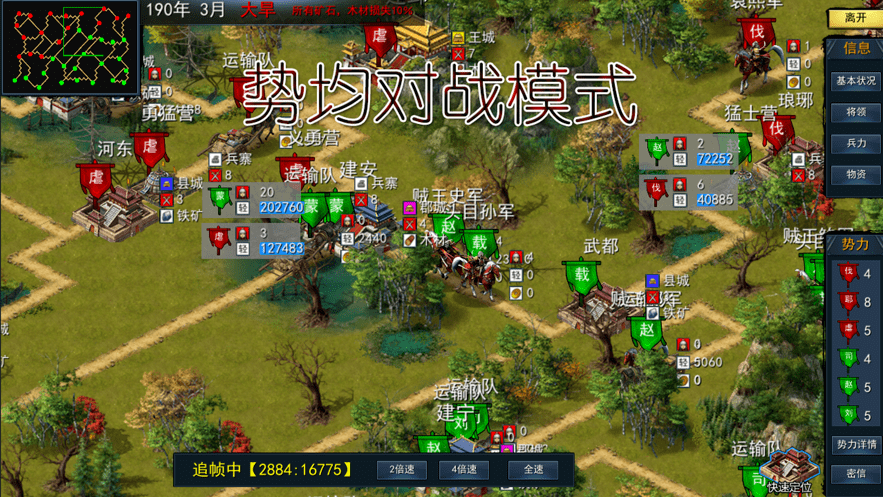 进入游戏的第一步是干两件事,抢底盘,委任主城升级和造兵(升级前期只要市集就好,造兵1个高级4个白色低级兵),开局你会有5W兵,足够你分兵两路去抢城池,注意只要是“贼”的白色旗帜城池都是能很容易打下来的。
