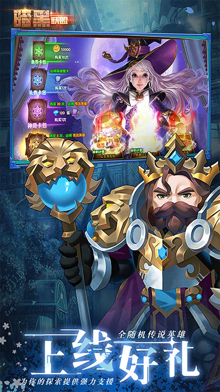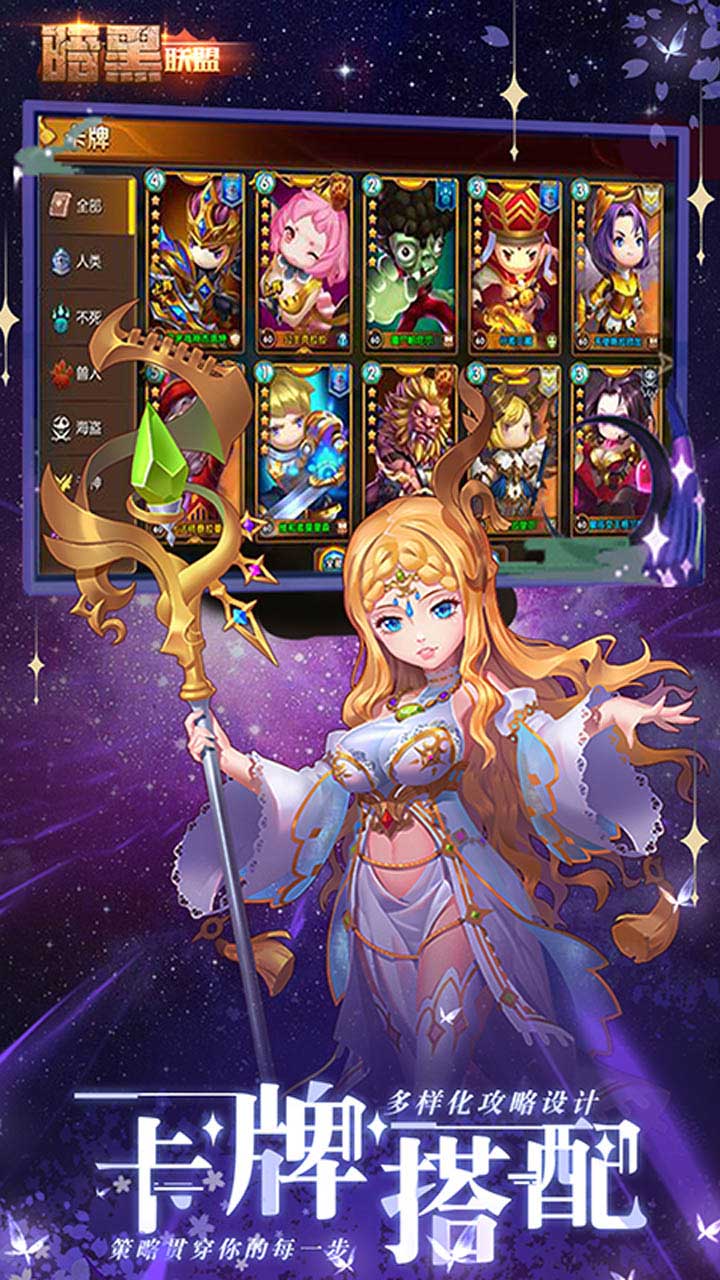 暗黑联盟是一款策略卡牌回合制类游戏,玩家在游戏中能够招募各种各样的同伴,来帮助你战斗,游戏中的角色每个都有不同的效果,合理利用各种角色,能够让战斗变得更加轻松。