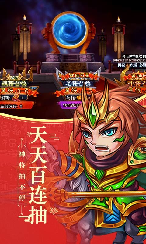 3.每日登陆礼包送100神将召唤令,每日百连抽,200抽必出神将!