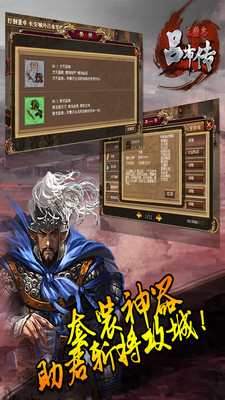 在游戏中,你将扮演‘三国第一猛将’吕布,手持方天画戟,跨骑赤兔马,拥美人以战天下,演义「飞将出世、争夺兖州、徐州风云、虎步江淮」等耳熟能详的乱世风云!