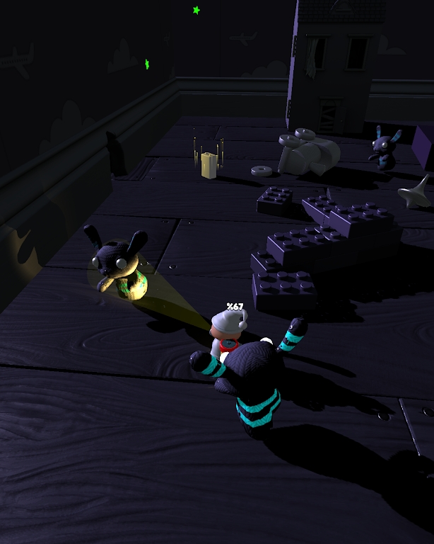 3、昏暗的游戏背景,非常有带入感,诡异的兔子玩偶,不被光照就会动,蹦蹦跳跳的小人,看不到世界的危险