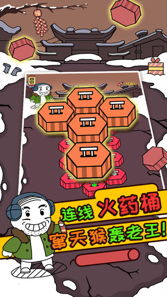 轰炸老王是一款乐无穷的解谜闯关小游戏,这款游戏中充斥着浓郁国风漫画风格,在这里我们要将每一个关卡中的窜天猴用引线给连接起来,找到正确的触发方式来让这些窜天猴能够爆炸,将老王炸上天,滑稽的游戏画风,充满年味的游戏背景,让整个游戏的过程充满无穷的乐趣。