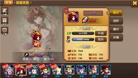 蠢萌三国在游戏中加入了武将羁绊玩法,将有特定缘分组合的武将配置在阵容中,能大幅提升阵容的战斗力。合理选择和搭配武将,能助你在本关卡和竞技场中所向披靡。如:桃园结义:刘备、关羽、张飞;男耕女织:诸葛亮、黄月英;江东春色:大乔、小乔、孙尚香;假戏真做:刘备、孙尚香;英雄美人:吕布、貂蝉等。