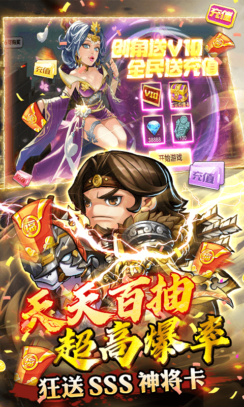 三国题材国战策略卡牌手游《萌将三国》乱世登场。免费领2万元红包,免费送无限真充和无限连抽,充值活动0元激活!注册即送VIP10、38888钻石、100招募令、千元真充,再领千元首充奖励!推图副本可领取5000元真充卡,达到等级再领6-500元充值卡。每天上线狂送SSS神将卡,送百连抽,酒馆超高爆率,抽卡抽到爽。众多稀有资源送不停,体验满星武将秒图的快感!游戏加入了可操控的战斗机制,让战斗结果尽在掌握!特色RPG玩法、丰富的策略性和多元玩法,更有大型军团战带你身临其境感受乱世三国的热血厮杀,将你带回那个热血澎湃、烽烟四起的三国乱世。