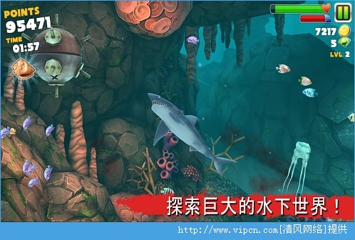 4、完成50个任务,寻找宝物取得金币与宝石,用来升级你的鲨鱼或者购买特殊救生道具。