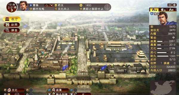 (1).评定。分为三个评定.势力、军团、都市。势力是你整个曹操集团在接下来的1年中的目标,军团是你下面所属军团的目标.军团系统会在后面讲到。都市是你下面城池的目标。评定在玩家角度看.是必须用的。因为一旦家大业大。地盘武将比较多.玩家自己管理不过来.这时是需要评定这个操作.他能让下面武将能自己管理自己.达到你给定的目标.大大减少自身操作麻烦。