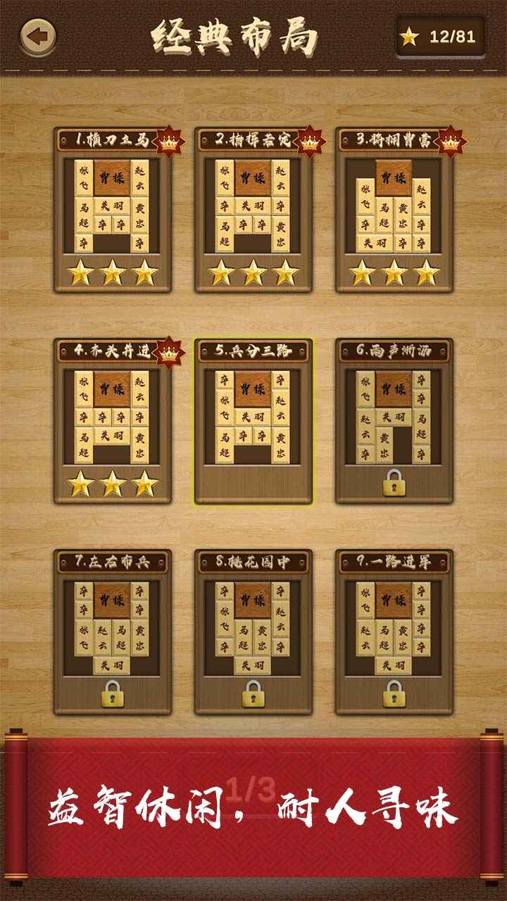 3.经典华容道玩法,再度为你呈现,发挥你的聪明才智,帮助曹操逃脱;