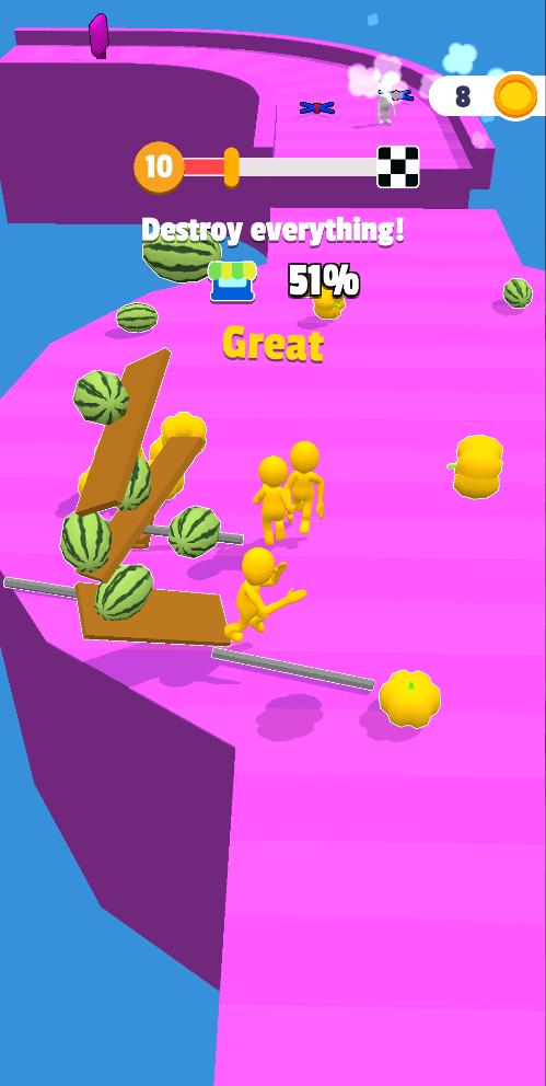 毁灭跑者Destroyer Runner是一款动作冒险跑酷闯关游戏,玩家控制小橡皮人在赛道上奔跑收集新的小人,躲避障碍物,可以破坏所有的地图,成为游戏的赢家,挑战各种艰难的机关。