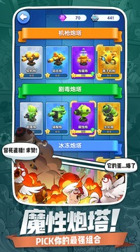 多种策略灵活搭配特色炮塔轮番作战,功能多样机枪、狙击、电磁、瘟疫、冰冻、核弹等。