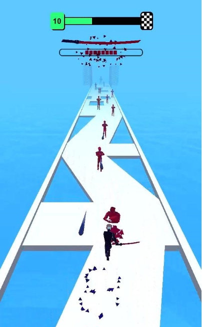 1、控制一个手里拿着红色长刀的黑衣反派,在跑道上冒险,通关的路上满是敌人。