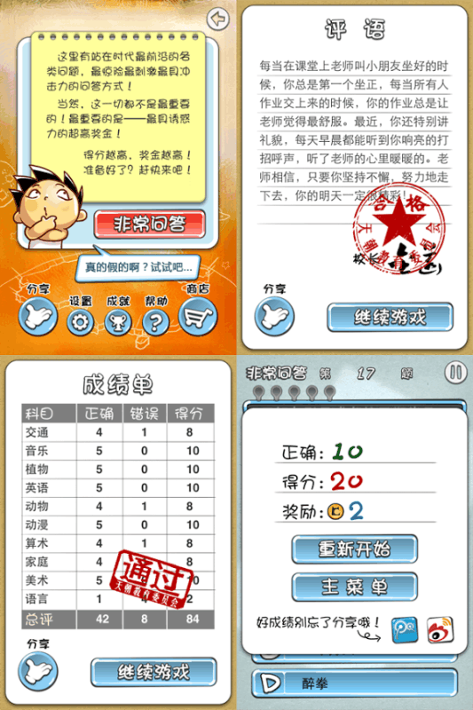 超过100个科目类别!11000多道知识性,趣味性俱佳的问题!只要达到60分就可以开始下一等级的学业!还有4种超强道具助您毕业!那么就让大家一起开动脑筋来回答问题吧!