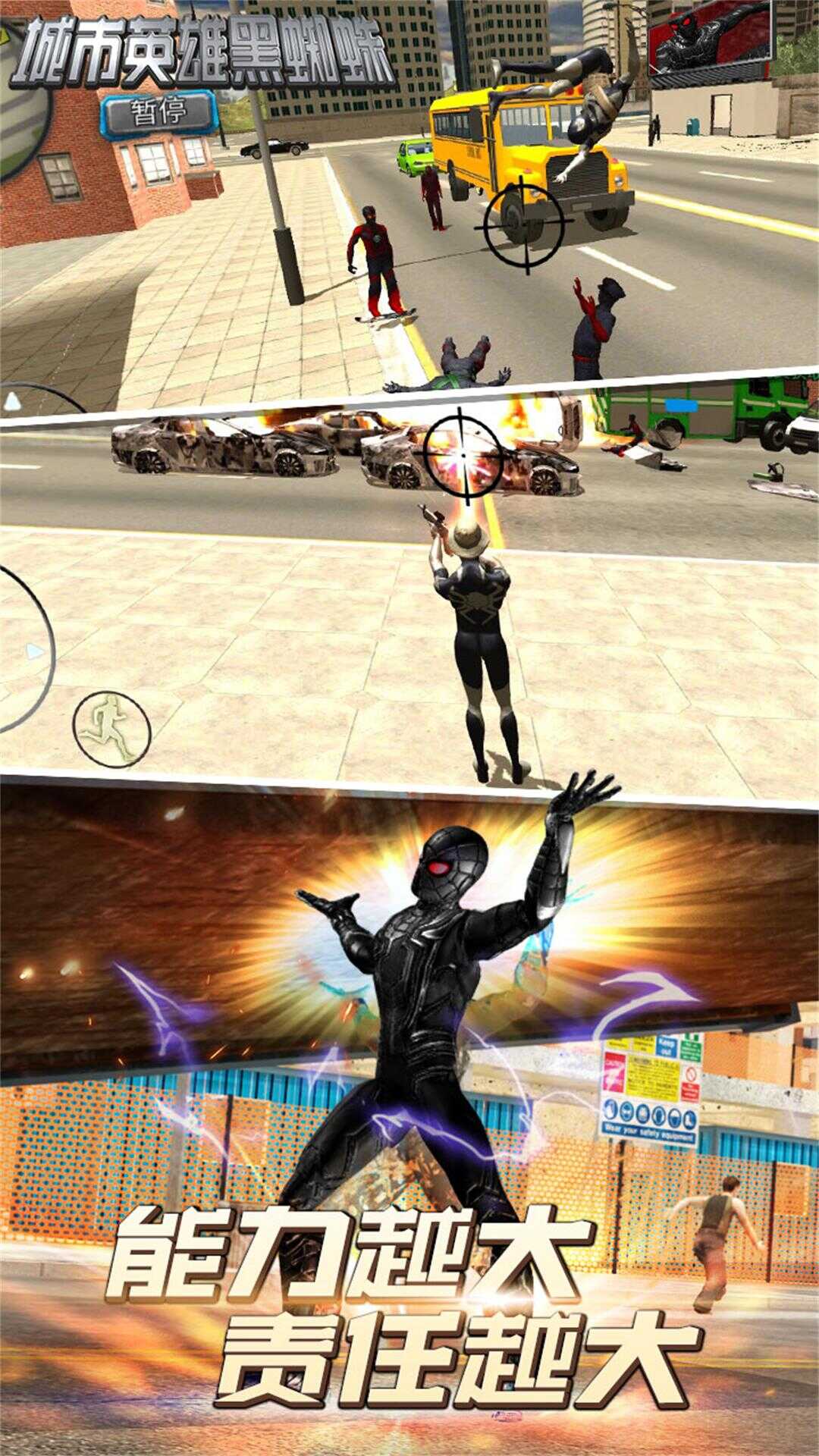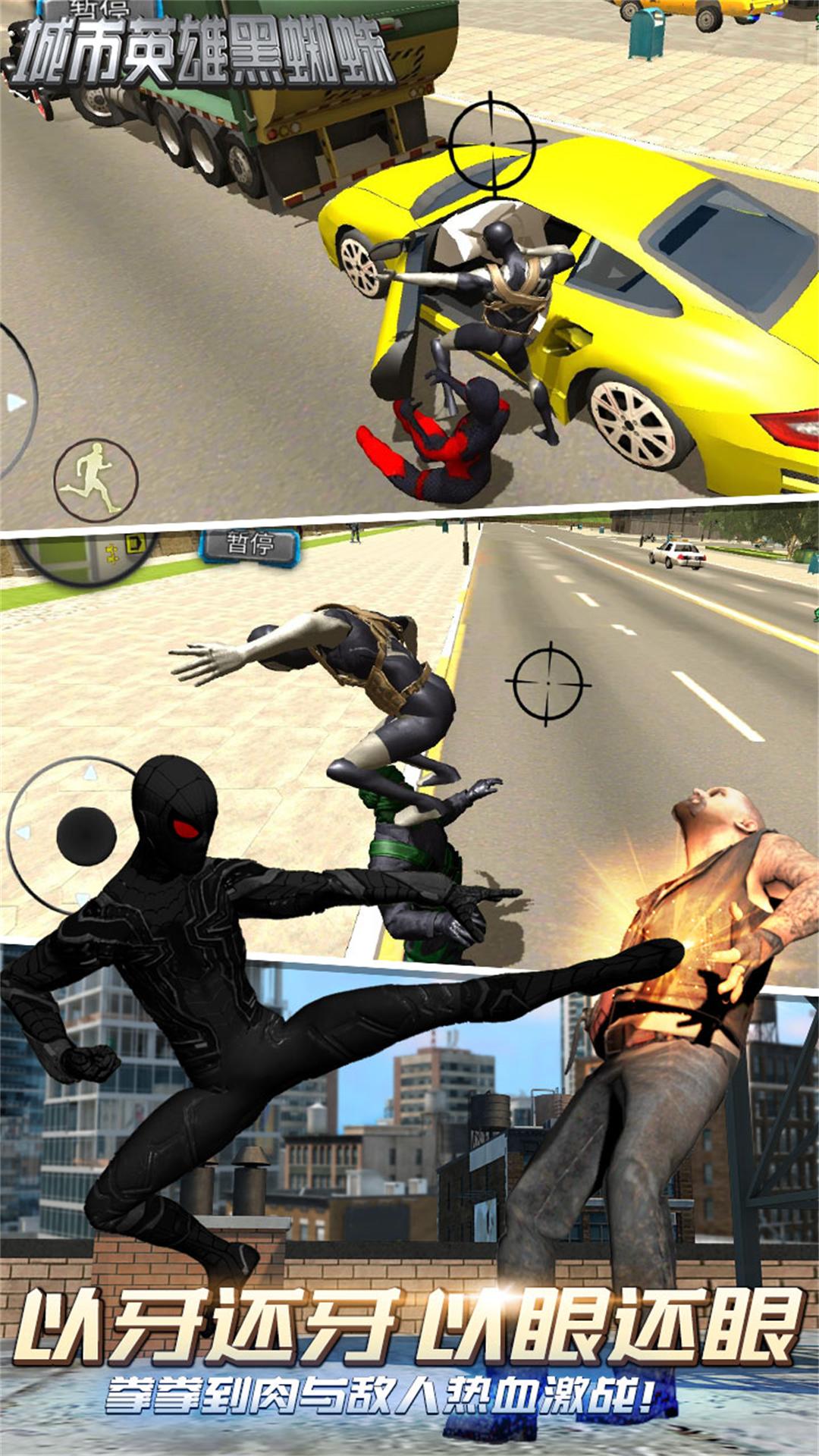 1、一种新的实体3D引擎渲染,逼真的战斗场景。化身蜘蛛侠穿梭于不同的高楼大厦。