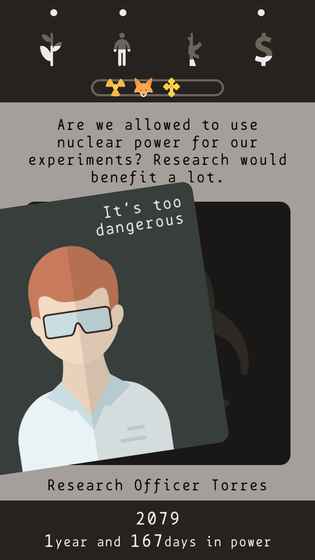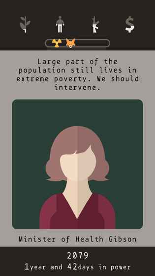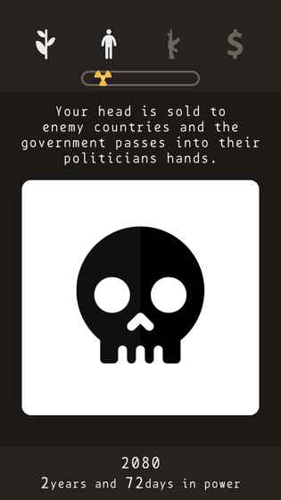 在2075年的末日后世,你将带领整个国家走向救赎抑或走向毁灭。当不同的请求和问题来到你面前,你只需左右划动卡牌就可做出回应,你的一举一动将最终决定这个国家的命运。不过要当心,总统可没那么好当!一股神秘力量让战争、疾病、饥荒接踵而至,人性陷入混沌。已经没人记得这一切如何发生,没人注意到怪异事件正席卷全球,没人能解释为何你百战不死、总能复生。所以,做每一次选择前务必深思熟虑,事情决不会平白无故地发生。再小的一件事都可能带你走向最终的胜利,抑或成为压垮你的最后一根稻草——众人之中,孰敌孰友?在这个充满着背叛、谜团、外星文明和仿生物种的复杂世界里,找出答案势必更加艰难。事已至此,在这场和时间的赛跑里,打好你自己的一手牌吧!