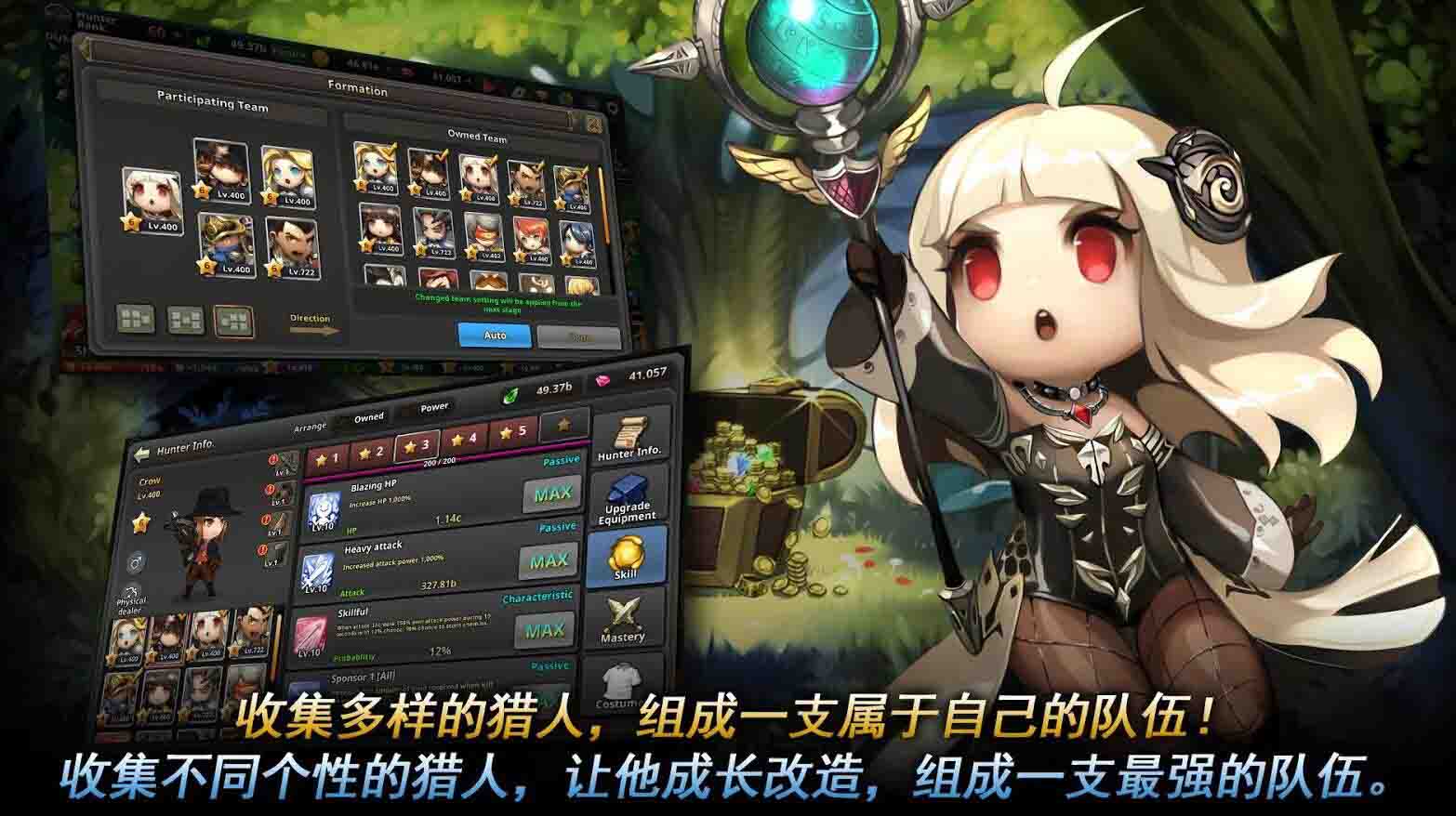 一个怪物猎人的世界的冒险之旅,女王被怪物军团抓走,一群猎人展开冒险之旅,寻找女王的下落,自动成长改造,自动采取行动的放置型无限攻城动作科幻片!手指不过是辅助道具!只需要你的指尖的点击就能让你享受趣味无限的游戏。