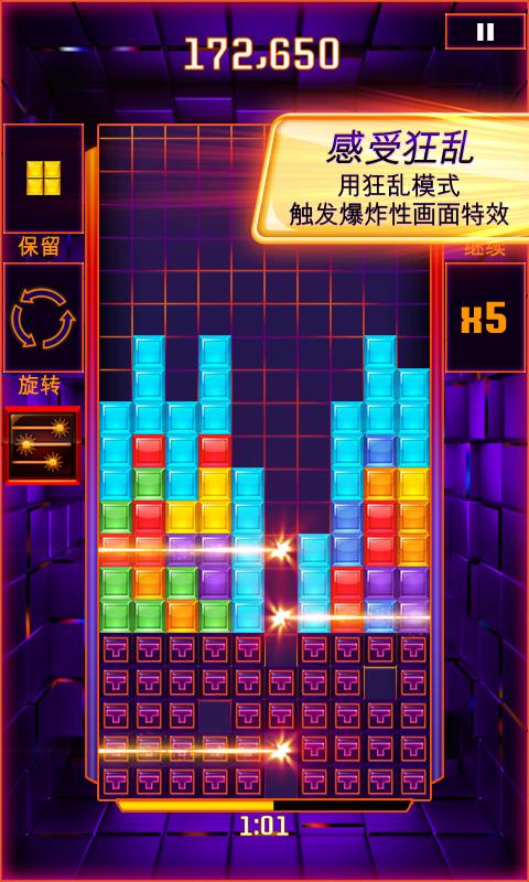 开启独有的狂乱模式,体验震撼的效果并赢取双倍得分。连续消行以保持狂乱,沉醉在非凡的连锁中并看着分数节节攀升。