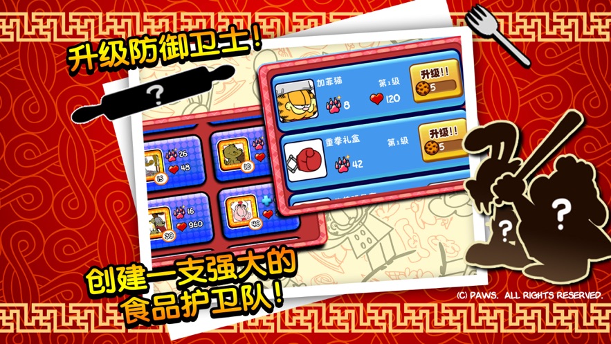 加菲猫总动员安卓版无限曲奇是一款不间断防御类游戏新作,与帕拉狗比较相似。游戏画面有趣操作也简单。只需要点画面左右两侧就可引导加菲移动,除了拿手上的报纸攻击,距离较远时会自动丢叉子,还有些小道具可以辅助攻击。