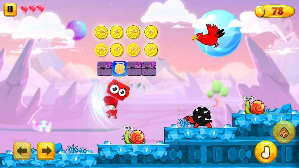 3.打破可破坏的砖块,射击以从悬挂的树上获取果实和力量。建议您小心穿越移动平台。