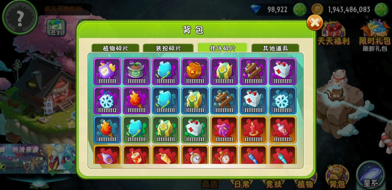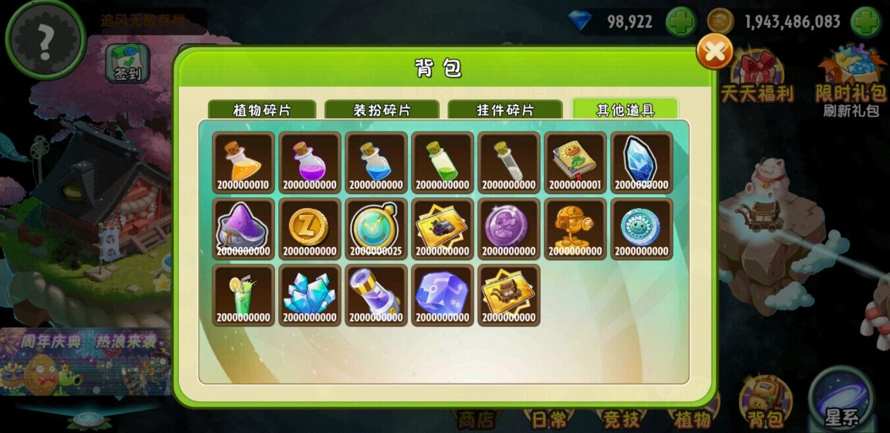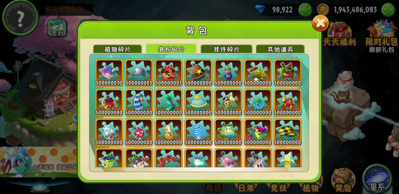 ,全植物全装扮包括新出的挂件所有道具500000000植物碎片500000000